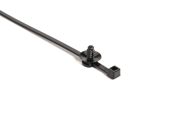 These two-piece fixings are supplied ready assembled and offer a simple and versatile method of bundling and fixing cables. The fir-tree base will easily push into pre-punched holes in panels or threaded, blind, holes and offers a very secure fixing. The two-piece design enables the head of the tie to be orientated to the required position to ease assembly, whilst the 'disc' on the top of the fir tree covers the hole and minimises the ingress of water and dirt. |