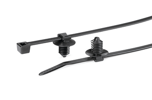 These two-piece fixings are supplied ready assembled and offer a simple and versatile method of bundling and fixing cables. The fir-tree base will easily push into pre-punched holes in panels or threaded, blind, holes and offers a very secure fixing. The two-piece design enables the head of the tie to be orientated to the required position to ease assembly, whilst the 'disc' on the top of the fir tree covers the hole and minimises the ingress of water and dirt. |