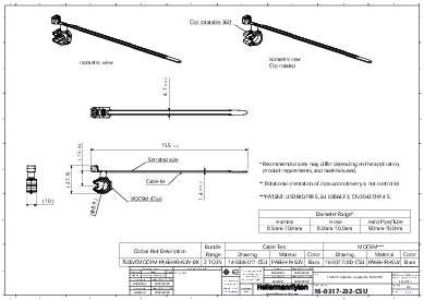 | Application | The MOC to Swivel Tie is a rotatable routing clip coupled to a cable tie that keeps two routings secured and separated. Tie provides additional security against axial slip by clamping around solid tube, pipe or harness. The swivel coupler allows the two routings to rotate independently of each other. |