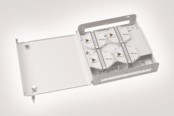 The Building Flexibility Point (BFP) box is manufactured from epoxy coated steel and is designed for the protection of fibre optic cable splices within internal environments. It contains 4 Hellafos splice trays which are mounted on the single hinged splice tray mounting plate. Each of the trays can achieve a maximum 24 splice capacity when using 3A heatshrink splices. The box is fitted with a lockable single hinged door, a back plate with cable strength member anchor points and the fibre storage area is positioned behind the hinged splice tray mounting plate. A range of glands and bulkhead plates for cable entry are detailed below and must be ordered separately. |
