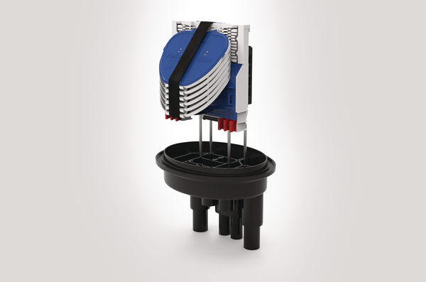 The FDN 59 Port Integrated Routing (IR) A Length closure with basket is supplied with a Polypropylene base. The base configuration of 58 round ports and 1 oval port covers a cable diameter range of 1.7 – 29.0mm when using Cablelok mechanical seals and 6.0 – 35.0mm when using heatshrink. The mounting system is manufactured from Grade 304 stainless steel and the backplane is an aluminium extrusion which manages 6 SE-IR MKII 3A splice trays. The position of the mounting system allows easy access for the routing of the fibre on to the trays and the basket provides storage space for the storage of fibre loops. The trays and fibre optic routing module are white which makes it easy to see the colour of the fibre elements as they are routed through the positive fibre management system. Fibre slot retaining blocks guide fibre elements in to the IR system, the foam pad on the retainer is partially cut through to accommodate a range of fibre counts. All IR system cover plates are coloured blue identifying them as removable parts allowing access to the fibre, the fibre slot retaining block and tray retaining clips are coloured red to aid in identification if they are dropped. |