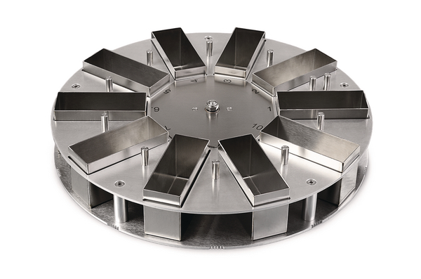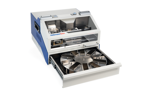 The M-BOSS Compact with included Organiser system gives the added advantage of a self-contained storage system within the print unit. The organiser is a 10 container carousel storage system that can be programmed to hold either an individual or a pre-defined set of marker plates. This means that users have the flexibility to manage how they work with the printed output. A simple input screen on the top of the machine is used to specify the quantity per container within the carousel. The carousel drawer when opened extends 430 mm from the front of the printer. |