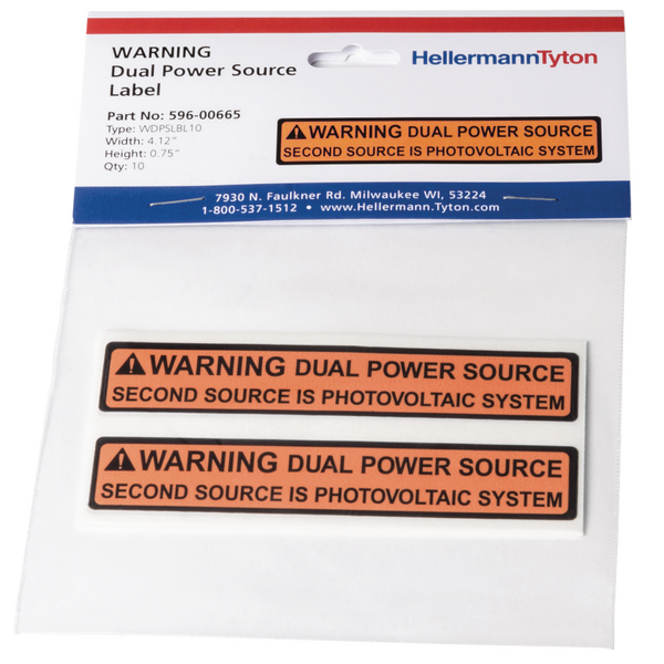 | Technical Description | 4.12" X .75" White text on a Red background that reads as;" WARNING - DUAL POWER SOURCE SECOND SOURCE IS PV SYSTEM." 50 per roll |