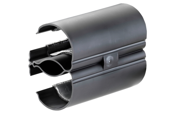 | Application | The split outer stiffener SHa is used for outer stiffening of the jacket of the speedpipe SRV 50/8x10. The split double stiffener DSHa is used for the outer stiffening of the jackets of two SRV 50/8x10. Both versions are required in a protective pipe/cable protection pipe before the ADE/TDUX sealing element is installed. The accessories prevent the pressure of the TDUX from changing the shape of the internal speedpipe (ovalization). Fibre optic cables can still be blown in. |