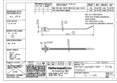 | Solicitud | Precintos con clip de fijación en formato de flecha (arrowhead). Ideales para sujeción y fijación de alambres, cables, caños, mangueras y tubos en láminas. Utilizados en diferentes industrias como automotriz, aeroespacial, electrodoméstica y panel eléctrico. |