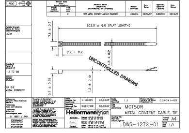| Application | The Metal Content Tie is a cable tie specifically designed for use in the food and pharmaceutical processing industries. A unique manufacturing process, involving the inclusion of a metallic pigment, enables even small 'cut-off' sections of the tie to be detected by standard metal-detecting equipment. Ideally suited for the installaton of cabling in and around the manufacturing process. |
