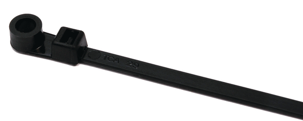 This range of one piece cable ties have a built in mounting hole and once fastened around the cables the bundle can be simply secured to the panel with a screw or bolt. The tie is fitted to the panel first and then the cables can be added. |