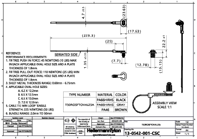 | Application | One-piece cable tie and mount offers a simple bundling and mounting solution. The innovative design of this fir tree establishes a 360-degree interface with the panel hole, ensuring a more secure fit. The oval shape won’t rotate once inserted, ensuring proper routing of wires and hoses. The disc feature prevents rattling in high-vibration applications and protects against debris ingress. |