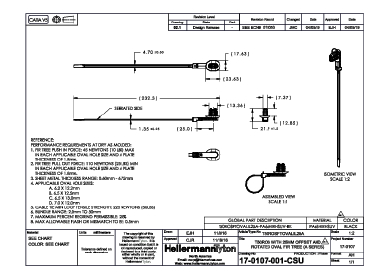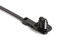 | Application | One-piece cable tie and mount offers a simple bundling and mounting solution. The innovative design of this fir tree establishes a 360-degree interface with the panel hole, ensuring a more secure fit. The oval shape won’t rotate once inserted, ensuring proper routing of wires and hoses. The disc feature prevents rattling in high-vibration applications and protects against debris ingress. |