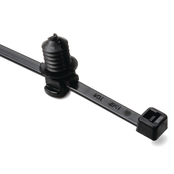 These two-piece fixings are supplied ready assembled and offer a simple and versatile method of bundling and fixing cables. The fir-tree base will easily push into pre-punched holes in panels or threaded, blind, holes and offers a very secure fixing. The two-piece design enables the head of the tie to be orientated to the required position to ease assembly, whilst the 'disc' on the top of the fir tree covers the hole and minimises the ingress of water and dirt. |
