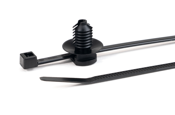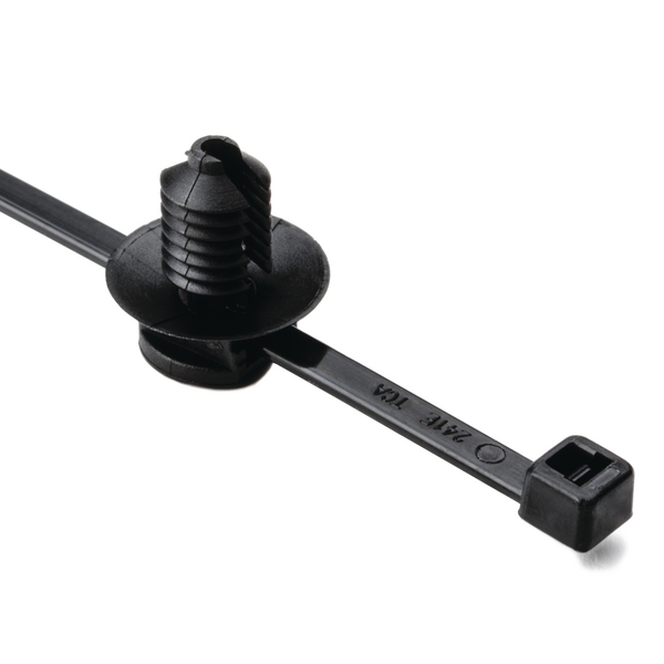 These two-piece fixings are supplied ready assembled and offer a simple and versatile method of bundling and fixing cables. The fir-tree base will easily push into pre-punched holes in panels or threaded, blind, holes and offers a very secure fixing. The two-piece design enables the head of the tie to be orientated to the required position to ease assembly, whilst the 'disc' on the top of the fir tree covers the hole and minimises the ingress of water and dirt. |