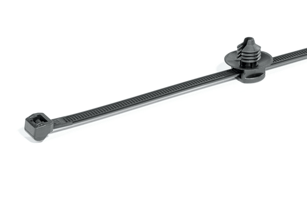 These two-piece fixings are supplied ready assembled and offer a simple and versatile method of bundling and fixing cables. The fir-tree base will easily push into pre-punched holes in panels or threaded, blind, holes and offers a very secure fixing. The two-piece design enables the head of the tie to be orientated to the required position to ease assembly, whilst the 'disc' on the top of the fir tree covers the hole and minimises the ingress of water and dirt. |