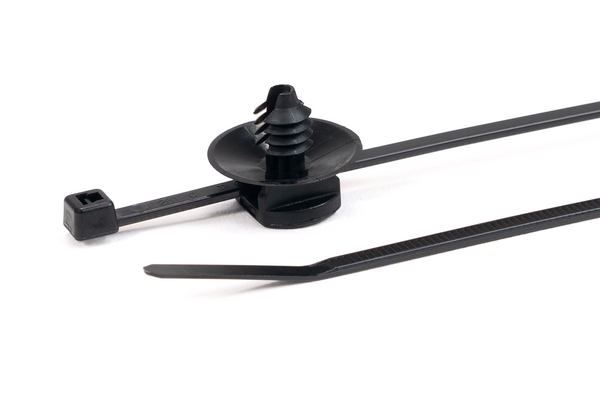 These two-piece fixings are supplied ready assembled and offer a simple and versatile method of bundling and fixing cables. The fir-tree base will easily push into pre-punched holes in panels or threaded, blind, holes and offers a very secure fixing. The two-piece design enables the head of the tie to be orientated to the required position to ease assembly, whilst the 'disc' on the top of the fir tree covers the hole and minimises the ingress of water and dirt. |