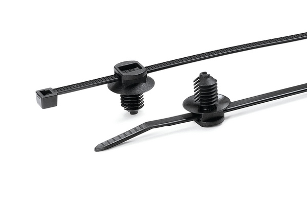 These two-piece fixings are supplied ready assembled and offer a simple and versatile method of bundling and fixing cables. The fir-tree base will easily push into pre-punched holes in panels or threaded, blind, holes and offers a very secure fixing. The two-piece design enables the head of the tie to be orientated to the required position to ease assembly, whilst the 'disc' on the top of the fir tree covers the hole and minimises the ingress of water and dirt. |
