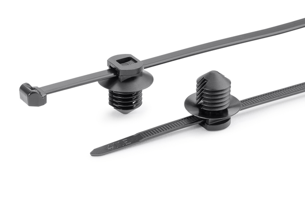 These two-piece fixings are supplied ready assembled and offer a simple and versatile method of bundling and fixing cables. The fir-tree base will easily push into pre-punched holes in panels or threaded, blind, holes and offers a very secure fixing. The two-piece design enables the head of the tie to be orientated to the required position to ease assembly, whilst the 'disc' on the top of the fir tree covers the hole and minimises the ingress of water and dirt. |