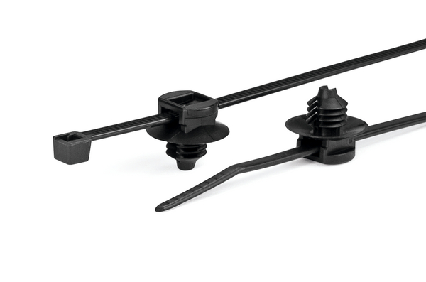 These two-piece fixings are supplied ready assembled and offer a simple and versatile method of bundling and fixing cables. The fir-tree base will easily push into pre-punched holes in panels or threaded, blind, holes and offers a very secure fixing. The two-piece design enables the head of the tie to be orientated to the required position to ease assembly, whilst the 'disc' on the top of the fir tree covers the hole and minimises the ingress of water and dirt. |