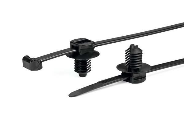 These two-piece fixings are supplied ready assembled and offer a simple and versatile method of bundling and fixing cables. The fir-tree base will easily push into pre-punched holes in panels or threaded, blind, holes and offers a very secure fixing. The two-piece design enables the head of the tie to be orientated to the required position to ease assembly, whilst the 'disc' on the top of the fir tree covers the hole and minimises the ingress of water and dirt. |