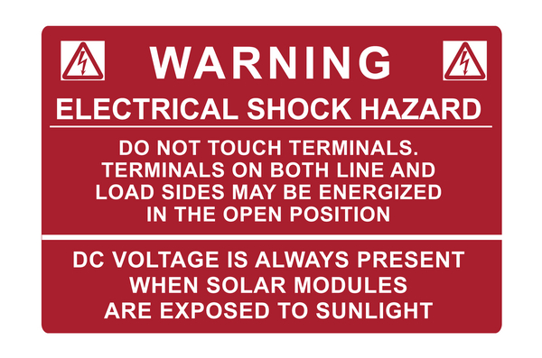 3.75" X 2.5" White text on red background that reads as: "WARNING - ELECTRICAL SHOCK HAZARD. DO NOT TOUCH TERMINALS. TERMINALS ON BOTH LINE AND LOAD SIDE MAY BE ENERGIZED IN THE OPEN POSITION. DC VOLTAGE IS ALWAYS PRESENT WHEN SOLAR MODULES ARE EXPOSED TO SUNLIGHT" - 50 per roll