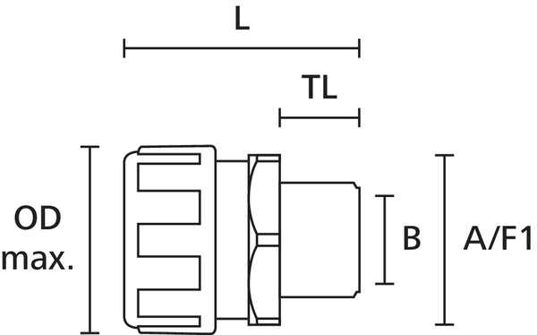 Straight PA66 fitting, fixed external thread. Fulfils IP65 with PSR conduits. Fulfils IP66 and IP67 with PSRSC conduits. |