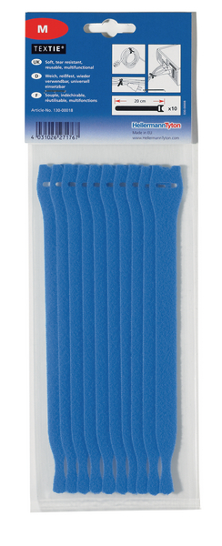 | Application | The TEXTIE-Series offers a soft bundling method and is ideal for use on telephone cables, optical fibre and network cables. These cable ties can be reopened and reused up to 400 times. A perfect solution for temporary installations and cable management for stage equipment, at outdoor events or for prototype harnessing. Also suitable for use in private or office applications. TEXTIE cable ties are available in various colours and can be used to colour-code cables and/or wires. |