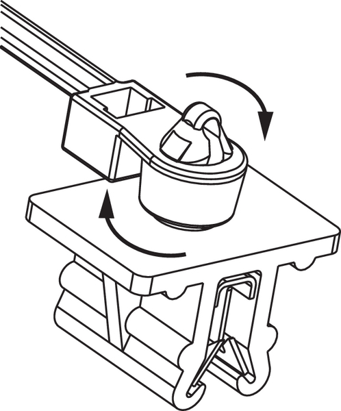 These EdgeClips are also mounted simply by pushing them onto an edge. A twistable EdgeClip is the ideal solution whenever flexible routing of cable bundles is required. The cable route can even be modified post-installation. The clips are available in 90° and 360° models for use with different types of cable tie. On the CBT30MR the bundle runs at the side of the clip, on the CBTO50R it runs over the centre of the clip. |