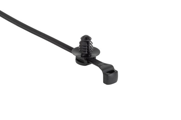 These two-piece fixings are supplied ready assembled and offer a simple and versatile method of bundling and fixing cables. The fir-tree base will easily push into pre-punched holes in panels or threaded, blind, holes and offers a very secure fixing. The two-piece design enables the head of the tie to be orientated to the required position to ease assembly, whilst the 'disc' on the top of the fir tree covers the hole and minimises the ingress of water and dirt. |