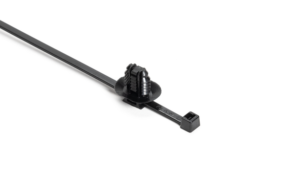 These two-piece fixings are supplied ready assembled and offer a simple and versatile method of bundling and fixing cables. The fir-tree base will easily push into pre-punched holes in panels or threaded, blind, holes and offers a very secure fixing. The two-piece design enables the head of the tie to be orientated to the required position to ease assembly, whilst the 'disc' on the top of the fir tree covers the hole and minimises the ingress of water and dirt. |