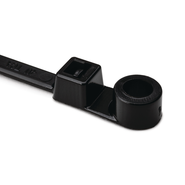 This range of one piece cable ties have a built in mounting hole and once fastened around the cables the bundle can be simply secured to the panel with a screw or bolt. The tie is fitted to the panel first and then the cables can be added. |
