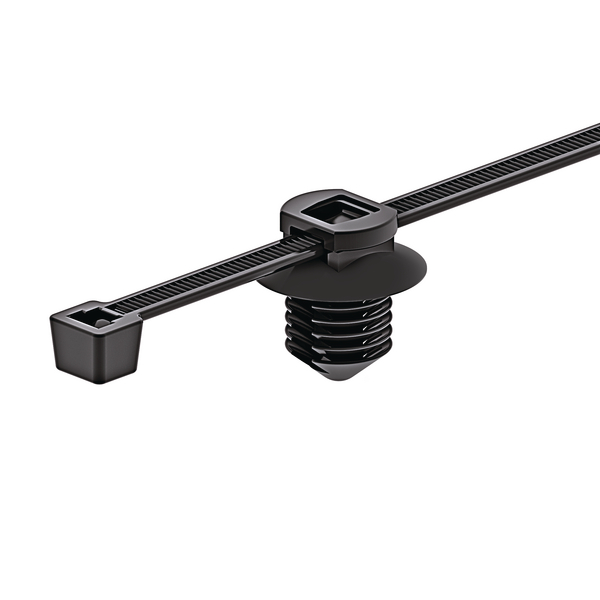 These two-piece fixings are supplied ready assembled and offer a simple and versatile method of bundling and fixing cables. The fir-tree base will easily push into pre-punched holes in panels or threaded, blind, holes and offers a very secure fixing. The two-piece design enables the head of the tie to be orientated to the required position to ease assembly, whilst the 'disc' on the top of the fir tree covers the hole and minimises the ingress of water and dirt. |