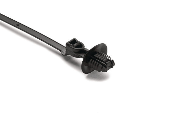 | Application | One-piece standoff cable tie and mount offers a simple bundling and mounting solution. The innovative design of this fir tree establishes a 360-degree interface with the panel hole, ensuring a more secure fit. The oval shape won’t rotate once inserted, ensuring proper routing of wires and hoses. Standoff feature positions bundles above a mounting hole. The disc feature prevents rattling in high-vibration applications and protects against debris ingress. |