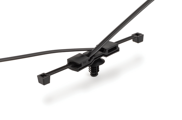 These two-piece fixings are supplied ready assembled and offer a simple and versatile method of bundling and fixing cables. The fir-tree base will easily push into pre-punched holes in panels or threaded, blind, holes and offers a very secure fixing. The two-piece design enables the head of the tie to be orientated to the required position to ease assembly, whilst the 'disc' on the top of the fir tree covers the hole and minimises the ingress of water and dirt. |