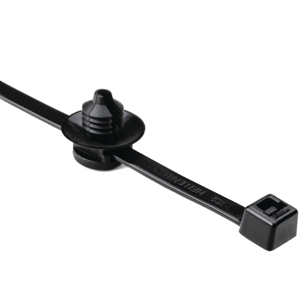 These two-piece fixings are supplied ready assembled and offer a simple and versatile method of bundling and fixing cables. The fir-tree base will easily push into pre-punched holes in panels or threaded, blind, holes and offers a very secure fixing. The two-piece design enables the head of the tie to be orientated to the required position to ease assembly, whilst the 'disc' on the top of the fir tree covers the hole and minimises the ingress of water and dirt. |
