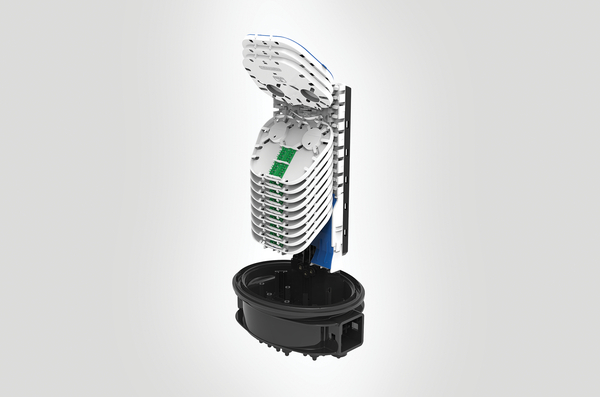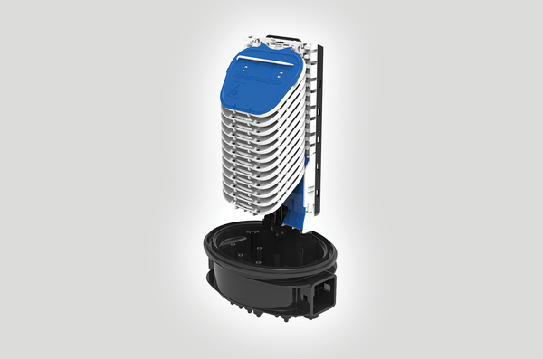 The CFNIRC 27 Port Integrated Routing (IR) M length closure is supplied with a curved entry block for managing rigid cables, a loop storage basket, IR Fibre Management system and splice trays. The base configuration of 26 round ports and 1 oval port covers a cable diameter range of 1.7 – 16.5mm when using Cablelok mechanical seals. The mounting system is manufactured from glass filled nylon and is supplied with 12 SE-IR CFN 3A splice trays. The position of the mounting system allows easy access for the routing of fibre on to the trays and the basket provides storage space for the storage of fibre loops. The trays and fibre routing module are white which makes it easy to see the colour of the fibre elements as they are routed through the positive fibre management system. The fibre entry block has dedicated PLC splitter accommodation for a maximum of 2 x 250µm bare end PLC splitters and fibre management for fibre direction changes and storage of excess fibre. Fibre retention guides manage the fibre elements into the IR system. All IR system cover parts are coloured blue identifying them as removable parts allowing access to the fibre. The CFN IR single element trays is manufactured from ABS and is fitted with 2 x 3A splice protector inserts which are positioned at the front of the tray providing a maximum splice capacity of 24 double stacked 3A (heatshrink) splice protectors upto 60mm long. |