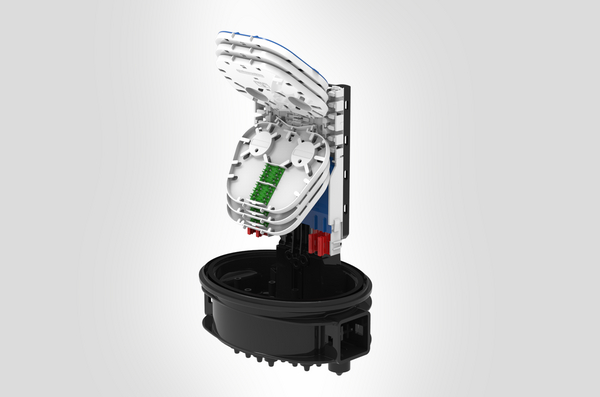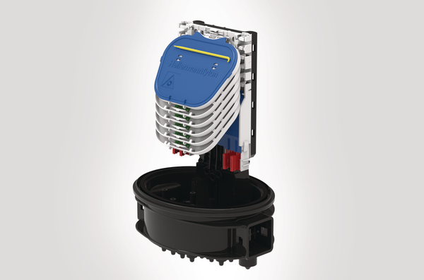 The CFNIRS 27 Port Integrated Routing (IR) S length closure is supplied with an IR foam entry block, a loop storage basket, IR Fibre Management system and splice trays. The base configuration of 26 round ports and 1 oval port covers a cable diameter range of 1.7 – 16.5mm when using Cablelok mechanical seals. The mounting system is manufactured from glass filled nylon and is supplied with 6 SE-IR CFN 3A splice trays. The position of the mounting system allows easy access for the routing of fibre on to the trays and the basket provides storage space for the storage of fibre loops. The trays and fibre routing module are white which makes it easy to see the colour of the fibre elements as they are routed through the positive fibre management system. The fibre entry block has dedicated PLC splitter accommodation for a maximum of 2 x 250µm bare end PLC splitters and fibre management for fibre direction changes and storage of excess fibre. Fibre retention guides manage the fibre elements into the IR system. All IR system cover parts are coloured blue identifying them as removable parts allowing access to the fibre. The CFN IR single element trays is manufactured from ABS and is fitted with 2 x 3A splice protector inserts which are positioned at the front of the tray providing a maximum splice capacity of 24 double stacked 3A (heatshrink) splice protectors upto 60mm long. |