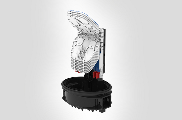 The CFNIRC 27 Port Integrated Routing (IR) S length closure is supplied with an IR foam entry block, a loop storage basket, IR Fibre Management system and splice trays. The base configuration of 26 round ports and 1 oval port covers a cable diameter range of 1.7 – 16.5mm when using Cablelok mechanical seals. The mounting system is manufactured from glass filled nylon and is supplied with 6 SE-IR CFN 3A splice trays. The position of the mounting system allows easy access for the routing of fibre on to the trays and the basket provides storage space for the storage of fibre loops. The trays and fibre routing module are white which makes it easy to see the colour of the fibre elements as they are routed through the positive fibre management system. The fibre entry block has dedicated PLC splitter accommodation for a maximum of 2 x 250µm bare end PLC splitters and fibre management for fibre direction changes and storage of excess fibre. Fibre retention guides manage the fibre elements into the IR system. All IR system cover parts are coloured blue identifying them as removable parts allowing access to the fibre. The CFN IR single element trays is manufactured from ABS and is fitted with 2 x 3A splice protector inserts which are positioned at the front of the tray providing a maximum splice capacity of 24 double stacked 3A (heatshrink) splice protectors upto 60mm long. |