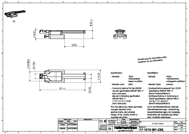 | Application | Connector Clip adapter for a connector on one site and a connector clip on the other site with a 11 mm slot according the USCAR specification EWCAP-005-11. The product has a bundling bar for strain relief of the connector cable. |