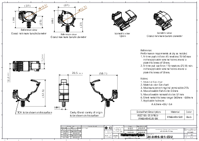 | Application | The Ratchet O-Clamp is designed for tight spaces, maintaining a low profile while providing an adjustable closure for a range of bundle sizes. It is intended for fluid routing and high-voltage cable management. An integrated fir tree provides a secure grip in round mounting holes with no additional hardware required. |