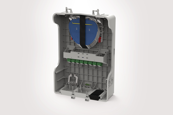 The HellermannTyton S4 wall mountable enclosures are suitable for both internal and external applications and have been developed for use within the last mile of the FTTX network. The medium MDU enclosure is 470 x 307 x 147mm (H x W x D) and manufactured in light grey (RAL 7035), UV stable ABS (Acrylonitrile Butadiene Styrene) and has an IP54, IK08 and UL-94 V0 rating. The MDU S4 cover can be customised with a moulded or labelled customer logo. The S4 C (Connectorised) can be configured with the small angled IR Fibre Management System (FMS) which accommodates 4 SE IR MKII splice trays giving a maximum of 96 3A splices and up to 3 PLC splitters. The Integrated Connector Module (ICU) holds 16 LC APC Quads and is fitted below the FMS. A loop through anchor bracket is pre-fitted on the left port of the base. The dual outlet of the bracket allows for loop through applications. The black rubber seals cover a cable range of 3-14mm OD cable. The 2 red retaining blocks guide the fibre elements onto the FMS and their foam pads can be cut through to accommodate a range of fibre counts. One multi-drop seal (24 x 7mm drops) is pre-fitted on the right port of the base. An extensive range of optional accessories is available upon request and include lock, multi-drop seals (24 x 7mm), M20 and M25 cable glands (up to 18mm), loop through anchor kit, drop cable anchor brackets, SC or coloured splice trays, splitter holders for trays, internal or external loop storage baskets. |