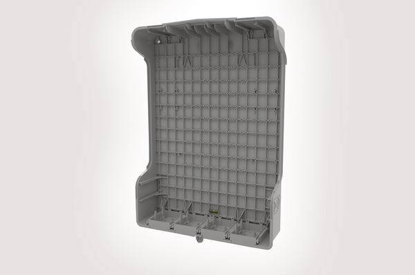 A 568 x 375 x 165mm (H x W x D) enclosure manufactured in light grey (RAL 7035) ABS (Acrylonitrile Butadiene Styrene). The enclosure is UV stable with an IP54, IK08 and V0 rating. Designed with 8 dual input/output ports, 4 across the bottom, 2 on the top and 2 on each side, each port will accommodate a 20 or 25mm cable gland. A 100 x 25mm inset position on the front cover allows for a customer logo to be moulded in to the enclosure. |