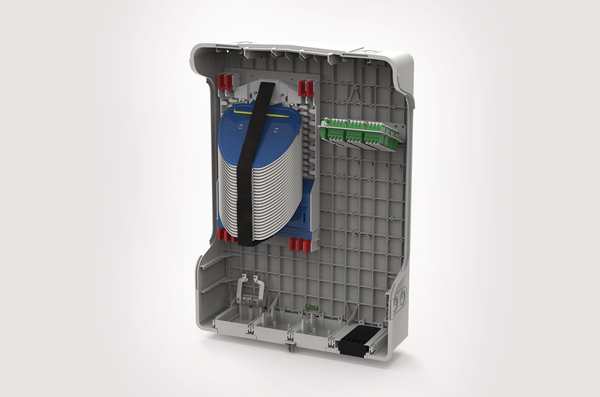 The largest MDU enclosure is 568 x 375 x 165mm (H x W x D) and manufactured in light grey (RAL 7035) ABS (Acrylonitrile Butadiene Styrene), UV stable with an IP54, IK08 and V0 rating. The MDU S5 cover can be customised with a moulded or labelled customer logo. The S5 C (Connectorised) can be configured with the standard top entry IR Fibre Management System (FMS) which accommodates 12 SE IR MKII splice trays giving a maximum of 288 ANT splices and up to 6 PLC splitters. The metal connector plate holds 24+3 LC APC Quads and is fitted on the right side of the FMS. The 10 red retaining blocks guide the fibre elements onto the FMS and their foam pads can be cut through to accommodate a range of fibre counts. A loop through anchor bracket is pre-fitted on the left port of the base. The dual outlet of the bracket allows for loop through applications. The black rubber seals cover a cable range of 3-14mm OD cable. One multi-drop seal (24 x 7mm drops) is pre-fitted on the right port of the base. An extensive range of optional accessories is available upon request and include lock, multi-drop seals (24 x 7mm), M20 and M25 cable glands (up to 18mm), loop through anchor kit, drop cable anchor brackets, SC or coloured splice trays, splitter holders for trays, internal or external loop storage baskets. |
