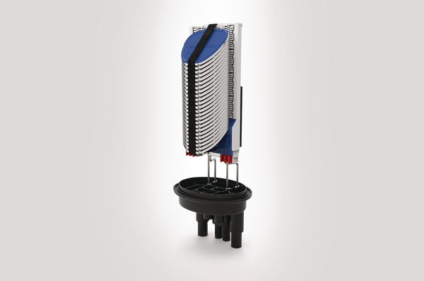 The FDN 59 Port Integrated Routing (IR) B Length closure with basket is supplied with a Polypropylene base. The base configuration of 58 round ports and 1 oval port covers a cable diameter range of 1.7 – 29.0mm when using Cablelok mechanical seals and 6.0 – 35.0mm when using heatshrink. The mounting system is manufactured from Grade 304 stainless steel and the backplane is an aluminium extrusion which manages 24 SE-IR MKII trays fitted with 3A splice bridges. The position of the mounting system allows easy access for the routing of the fibre on to the trays and the basket provides storage space for the storage of fibre loops. The trays and fibre optic routing module are white which makes it easy to see the colour of the fibre elements as they are routed through the positive fibre management system. Fibre slot retaining blocks guide fibre elements in to the IR system, the foam pad on the retainer is partially cut through to accommodate a range of fibre counts. All IR system cover plates are coloured blue identifying them as removable parts allowing access to the fibre, the fibre slot retaining block and tray retaining clips are coloured red to aid in identification if they are dropped. |