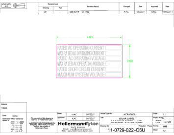 | Technical Description | 4" X 2" White text on red background that reads as: "RATED AC OPERATING CURRENT; MAX RATED AC OPERATING CURRENT; RATED AC OPERATING VOLTAGE; MAX RATED AC OPERATING VOLTAGE; RATED SHORT CIRCUIT CURRENT; MAXIMUM SYSTEM VOLTAGE." 50 per roll. Label is also printable using a thermal transfer printer to add the variable voltage information on demand. |