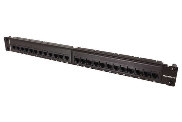 The MegaBand Panel has been designed to offer exceptional Category 5e performance and value and is available in 1U 24 port and 2U 48 port versions with optional rear cable management. The panel presents 24 Category 5e ports in 1U of space and is supplied with a sliding label panel and Rack Snap mounting fixings as standard. The MegaBand products are designed to support any data or voice protocol capable of running over a Category 5e cabling system. |