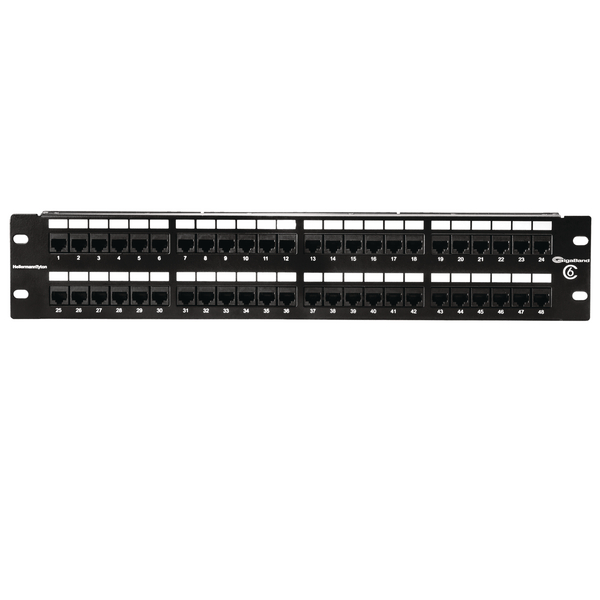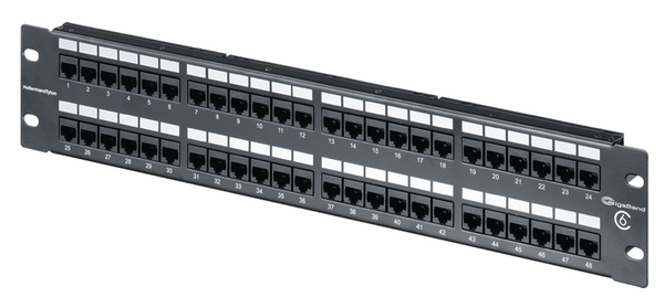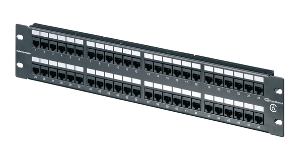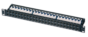 The Universal 110 Category 6 range of patch panels offer exceptional performance and are also available in 1U 24 port, 1U 48 port right angled and 12 port vertical versions. The 2U 48 Port Panel is constructed of 8 modular units, each offering 6 RJ45 ports allowing for any of the 6 port modules to be replaced in the case of port damage or failure. The Universal 110 2U 48 Port Panel is supplied with or with Rack Snap mounting fixings and an optional rear cable manager is also available. The Universal 110 Category 6 products are designed to support any data or voice protocol that is capable of running over a Category 6 cabling system. |
