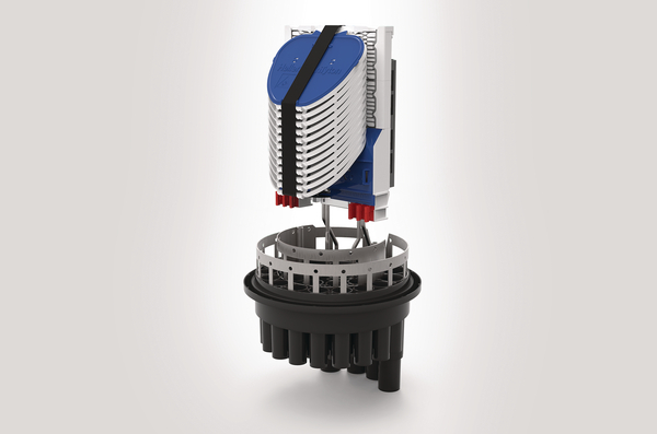 The UFC Integrated Routing (IR) B Length Single Stack closure with basket is available with a Cablelok (Polypropylene) or Heatshrink (Flame Retardant Polypropylene) base. The base configuration of 28 round ports and 2 oval ports covers a cable diameter range of 4.0 – 29.0mm when using Cablelok mechanical seals and 6.0 – 35.0mm when using heatshrink. The mounting system is manufactured from Grade 304 stainless steel and manages 12 Multi-Ribbon cable trays giving a maximum splice capacity of 144 (8 or 12 fibre) ribbon cables based on 12 ribbon cable splices per tray. The position of the mounting system allows easy access for the routing of the fibre on to the trays and the basket provides storage space for the storage of fibre loops. The trays and fibre optic routing module are white which makes it easy to see the colour of the fibre elements as they are routed through the positive fibre management system. Fibre slot retaining blocks guide fibre elements in to the IR system, the foam pad on the retainer is partially cut through to accommodate a range of fibre counts. All IR system cover plates are coloured blue identifying them as removable parts allowing access to the fibre, the fibre slot retaining block and tray retaining clips are coloured red to aid in identification if they are dropped. |