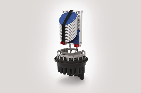 The UFC Integrated Routing (IR) B Length Single Stack closure is available with a Cablelok (Polypropylene) or Heatshrink (Flame Retardant Polypropylene) base. The base configuration of 28 round ports and 2 oval ports covers a cable diameter range of 4.0 – 29.0mm when using Cablelok mechanical seals and 6.0 – 35.0mm when using heatshrink. The mounting system is manufactured from Grade 304 stainless steel and the backplane is an aluminium extrusion which manages 12 SE-IR MKI 3A splice trays. The position of the mounting system allows easy access for the routing of the fibre on to the trays. The trays and fibre optic routing module are white which makes it easy to see the colour of the fibre elements as they are routed through the positive fibre management system. Fibre slot retaining blocks guide fibre elements in to the IR system, the foam pad on the retainer is partially cut through to accommodate a range of fibre counts. All IR system cover plates are coloured blue identifying them as removable parts allowing access to the fibre, the fibre slot retaining block and tray retaining clips are coloured red to aid in identification if they are dropped. |
