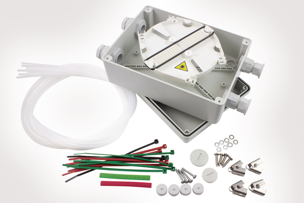 - Contém 1 bandeja de emenda Hellafos para até 24 protetores de emenda termoncolhíveis 3A (capacidade máxima 12 protetores)