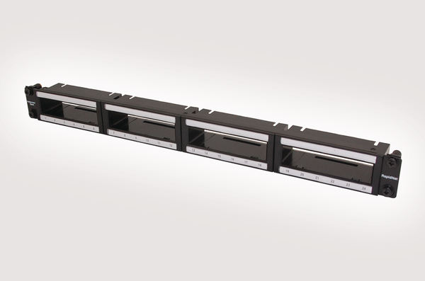 O Patch panel de 6 portos RapidNet acomoda quatro cassetes de cobre ou fibra de 6 portas. O painel oferece campos de etiquetagem duplos para cada cassete e é fornecido com fixações Rack Snap como padrão. As cassetes RapidNet simplesmente encaixam no painel, com um clipe de pressão. Um painel 1U totalmente carregado apresenta 24 portos RJ45 UTP Categoria 6A, Categoria 6 ou Categoria 5e RJ45. |