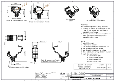 | Application | The Ratchet O-Clamp is designed for tight spaces, maintaining a low profile while providing an adjustable closure for a range of bundle sizes. It is intended for fluid routing and high-voltage cable management. An integrated fir tree provides a secure grip in round mounting holes with no additional hardware required. |