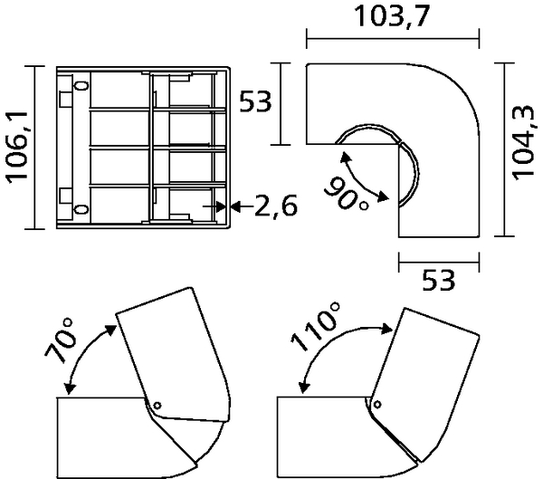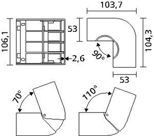 | Application | The external elbow is used at external angles of walls and surfaces whose cabling has being installed. It allows opening between 70° and 105°, the minimum radius of curvature being 1". |